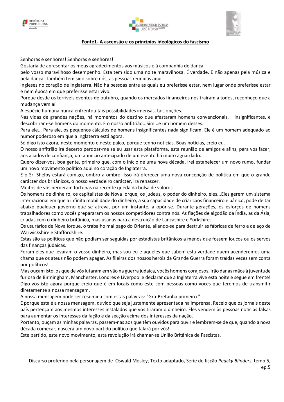 Retira do discurso de Mosley expressões que reflitam os seguintes princípios fascistas: anti-comunismo, nacionalismo, protecionismo, xenofobia/racismo.