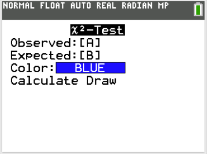 Stat->Test-X^2-Test shows the following, indicating that it will read the observed in Matrix [A] and output the expected values into Matrix [B]