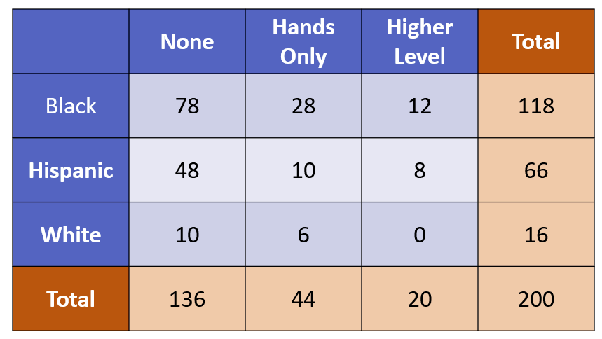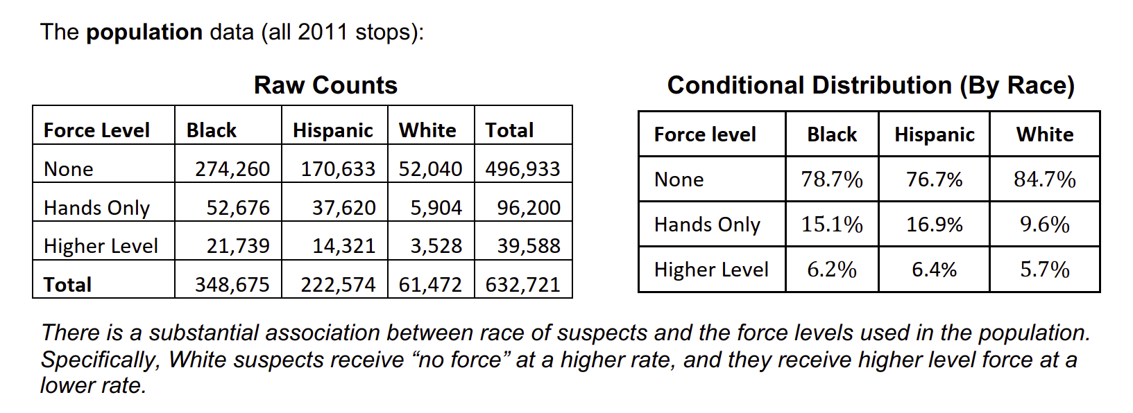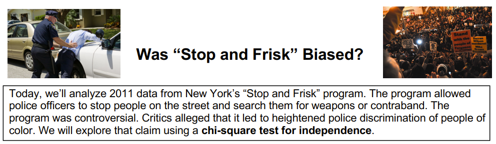 We will use a Chi-Square test for Independence, which takes 1 sample (NY Police Stop/Frisk Data) and compare 2 Variables (Racial Identity and Police Force) and see if those variables are independent or associated within this sample.