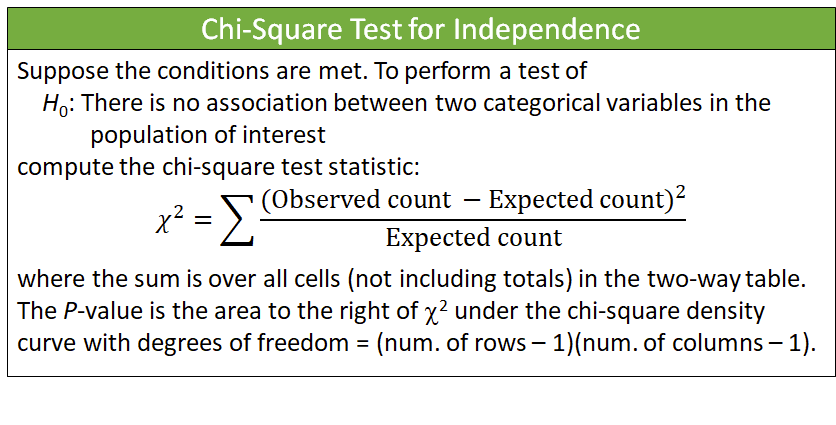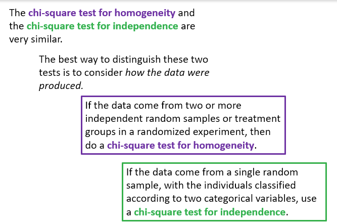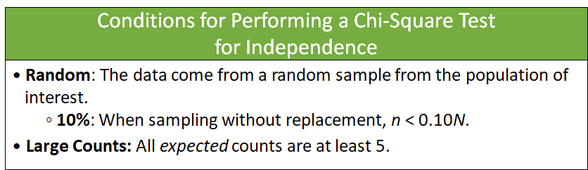 All three have similar conditions and mechanics. The hypothesis/conclusions are worded a bit differently. We will work on distinguishing the three in a bit. Right now, you will learn the Chi-Square test for Independence.