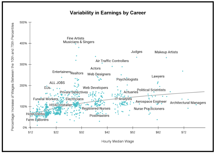 Which careers have the largest wage gap between the 10th & 75th percentiles?