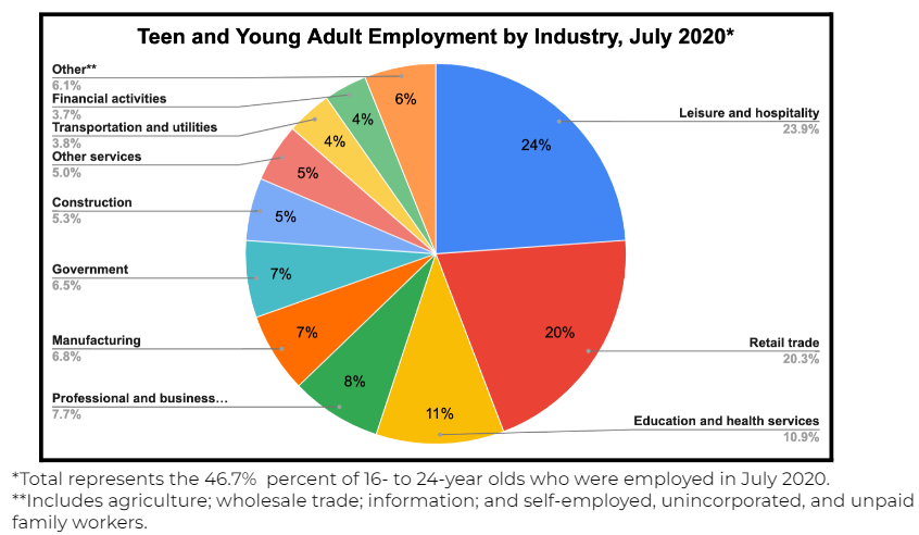 Look closely at the fine print for what’s included in the Other** category. What can you assume is the highest percentage of teens and young adults working in any one of the fields listed? Justify your response.