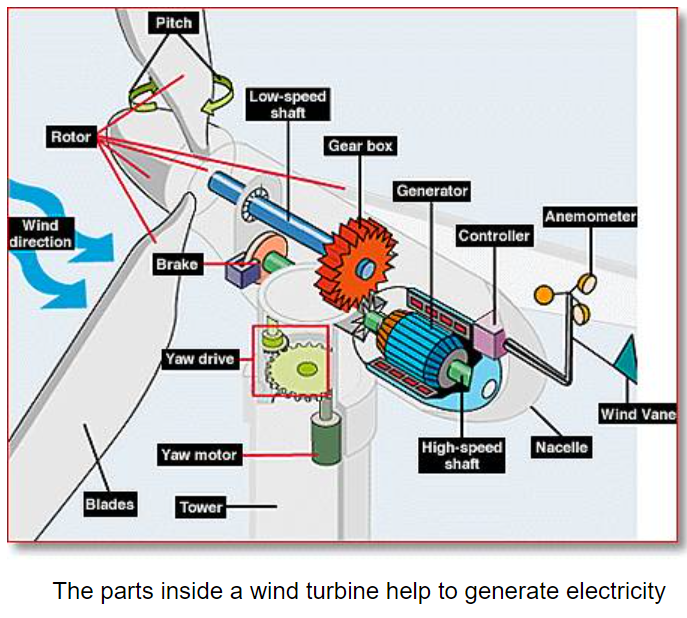 When the wind turns the blades, the blades turn a shaft inside the turbine. This shaft is big, but turns slowly. The shaft, however, is connected to a number of gears which causes a smaller shaft to turn much faster. This smaller shaft drives the electrical generator which generates the electricity that can be used by homes and businesses.