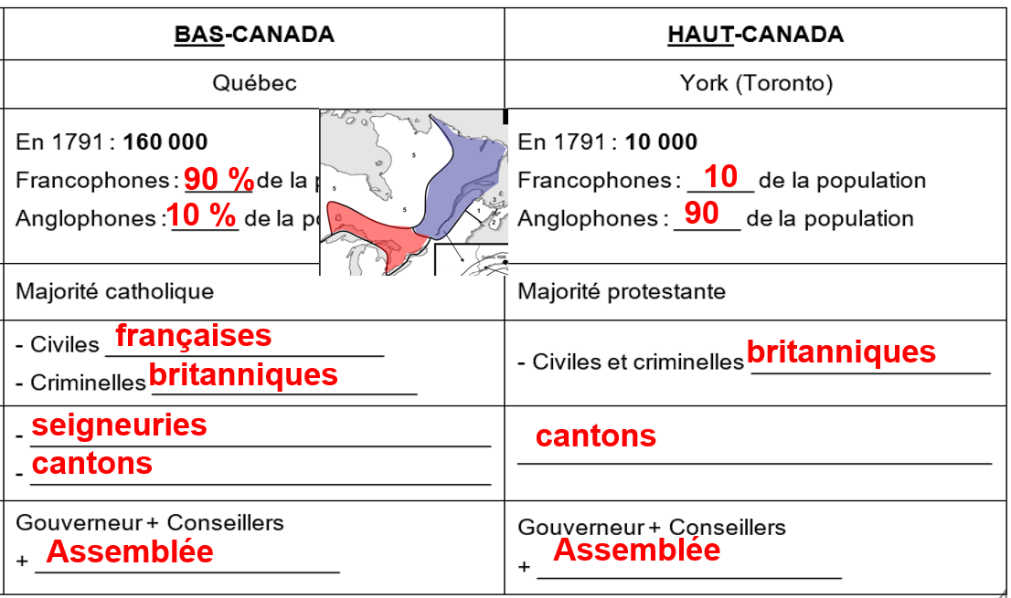 Dans la colonie du Bas-Canada (en bleu sur la carte), la population est