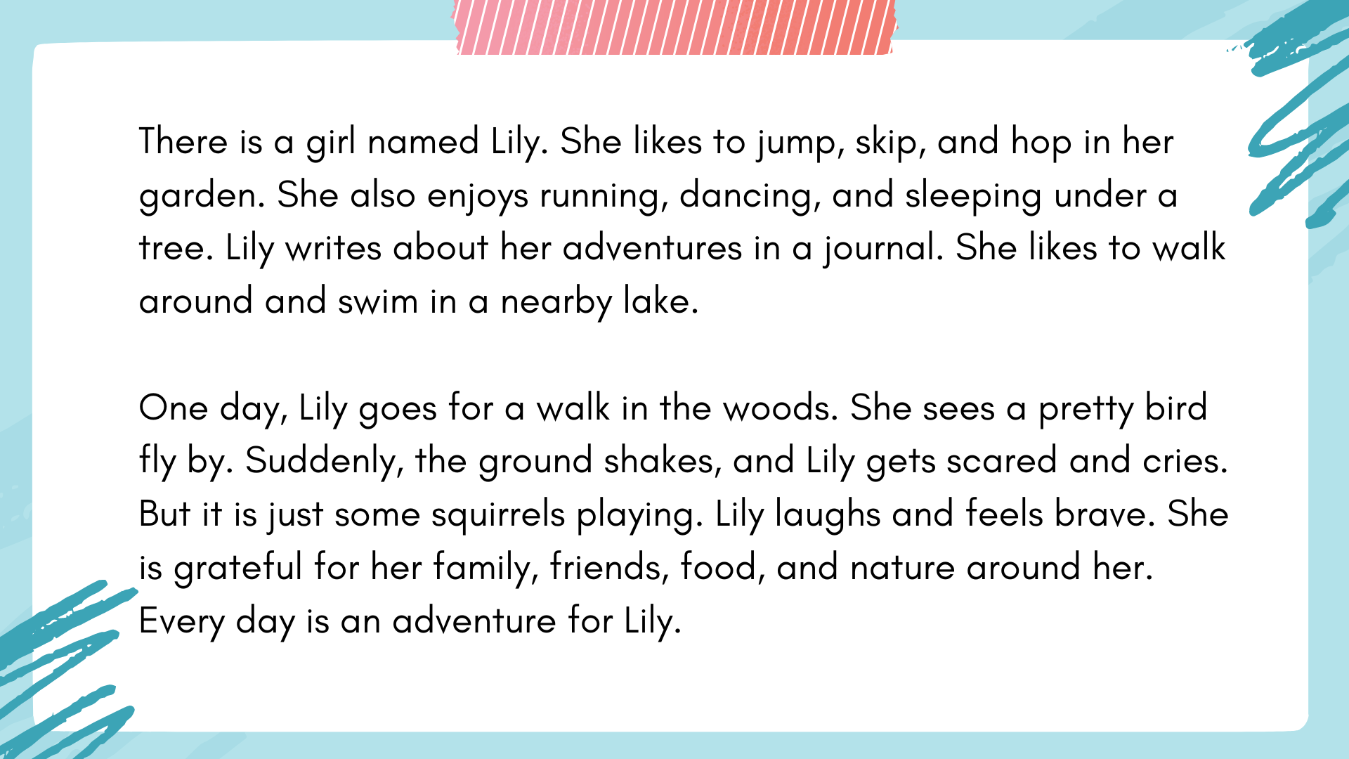 she likes to _______ around and _______ in a nearby lake