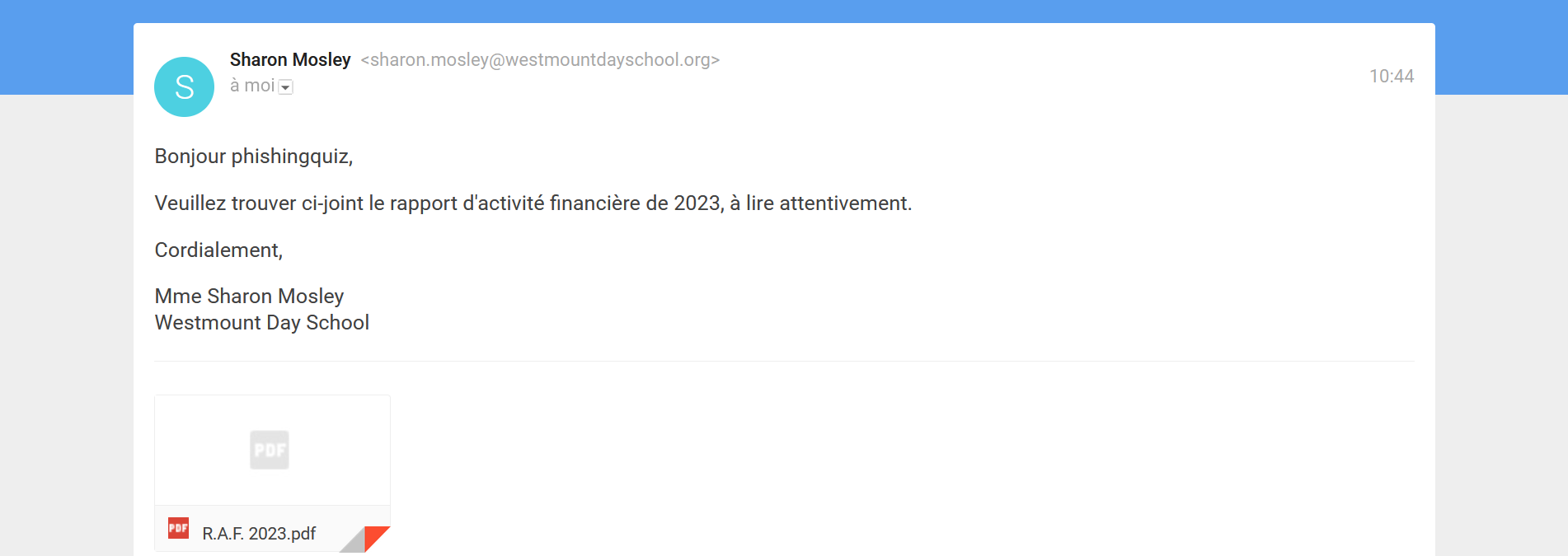 Pensez-vous qu'il s'agit d'un e-mail de phishing ou d'un e-mail légitime ?Les e-mails de l'école sont envoyés de l'adresse "sharon.mosley@westmountschool.org"