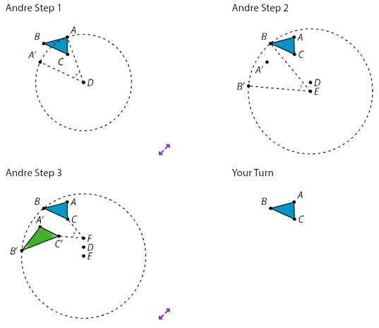 Andre tried to rotate triangle 45 degrees counterclockwise. He knows something went wrong because the image doesn’t seem to be congruent to the original figure.