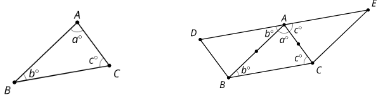 Elena wants to prove that the measures of the 3 angles in a triangle always sum to 180 degrees. She starts by using rigid motions to rotate triangle ABC 180 degrees around 2 midpoints.