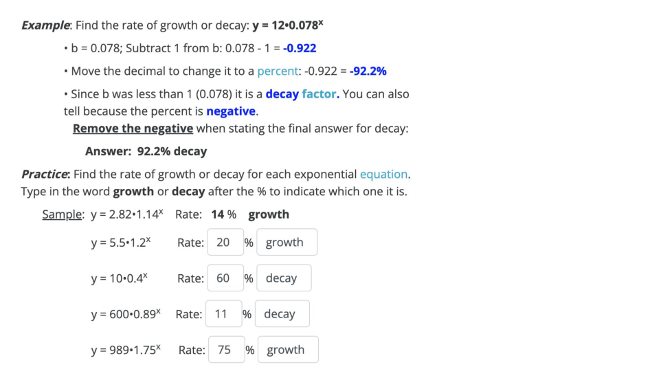 For y=5.5*1.2^{x}, the rate is _______ % and it is exponential _______ .