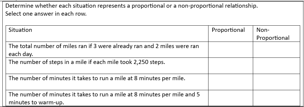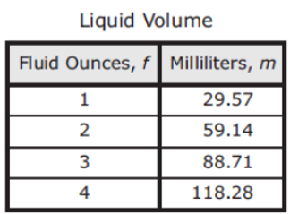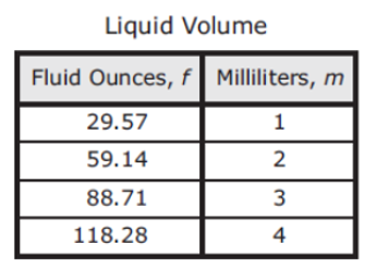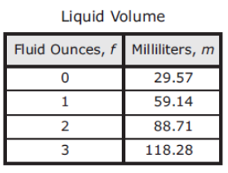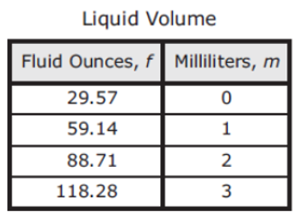 The approximate volume in milliliters, m, for a volume of f fluid ounces is 29.57 time the value of f. Which table represents this relationship?