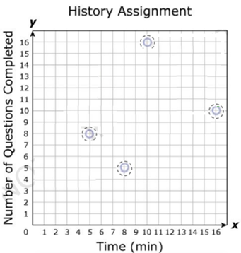 A student took 32 minutes to complete a 20-question history assignment. Choose two points that lie on the line with the slope that best represents the number of questions completed per minute