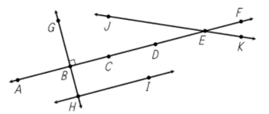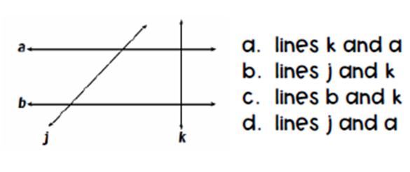 The picture shows lines a, b, j, and k. Which of the following pairs of line intersect but are not perpendicular?