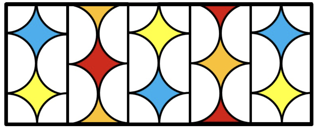 The students in Mr. Rivera's art class are designing a stained-glass window to hang in the school entryway. The window will be 2 feet tall and 5 feet wide. They have drawn the design below: