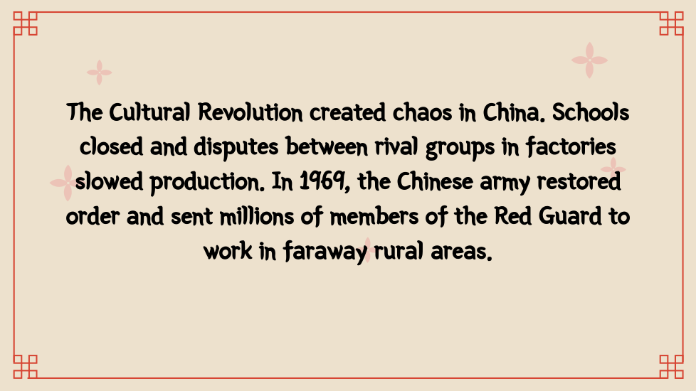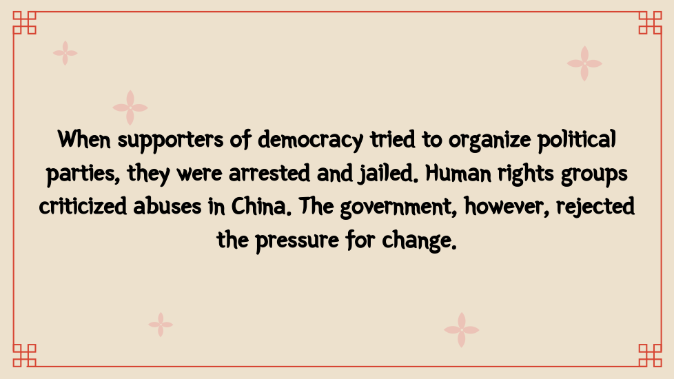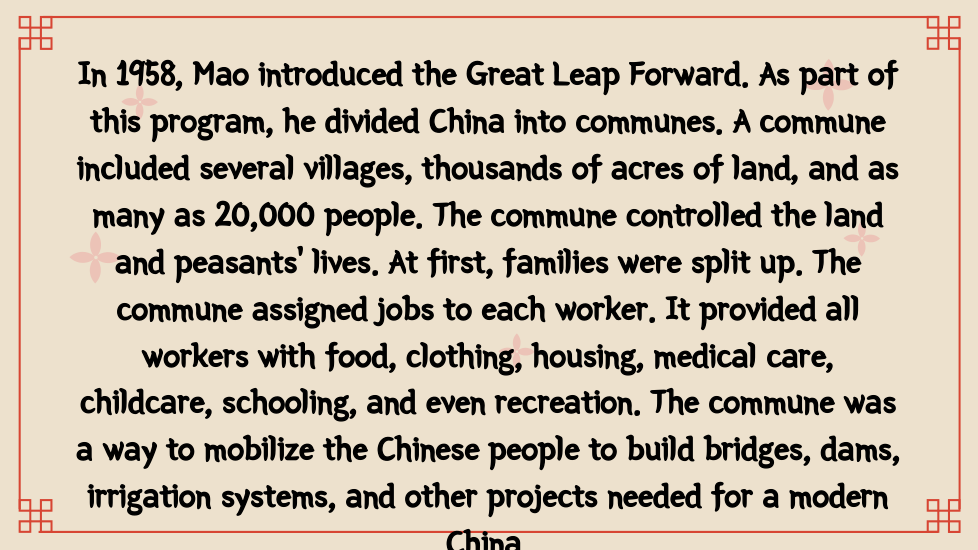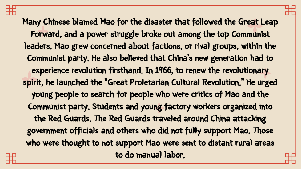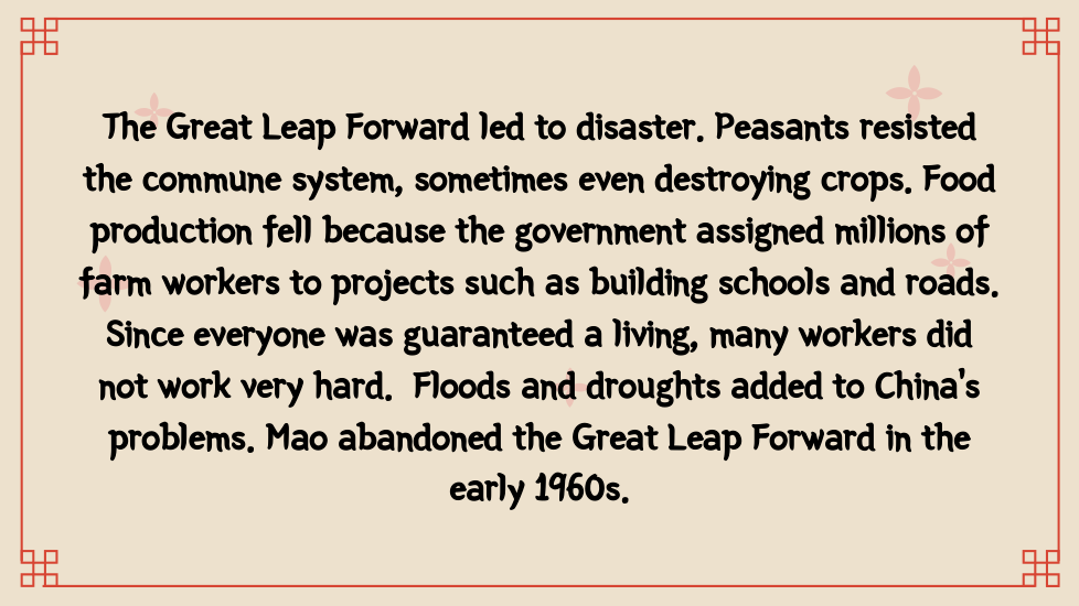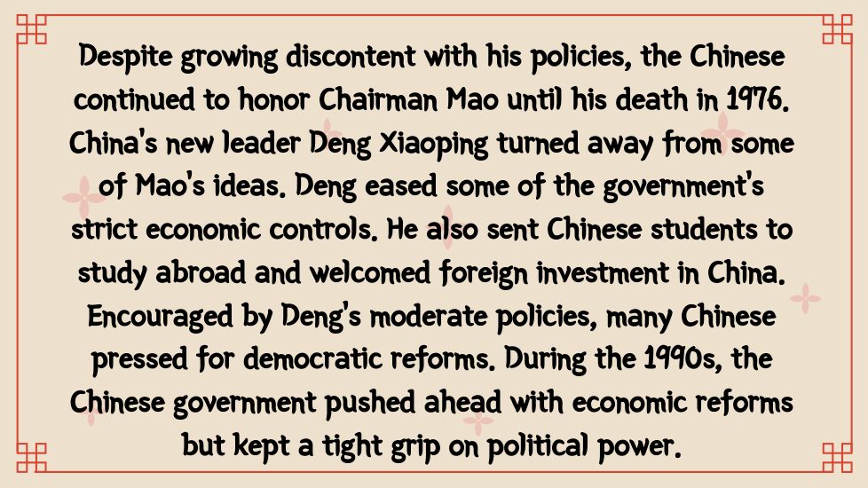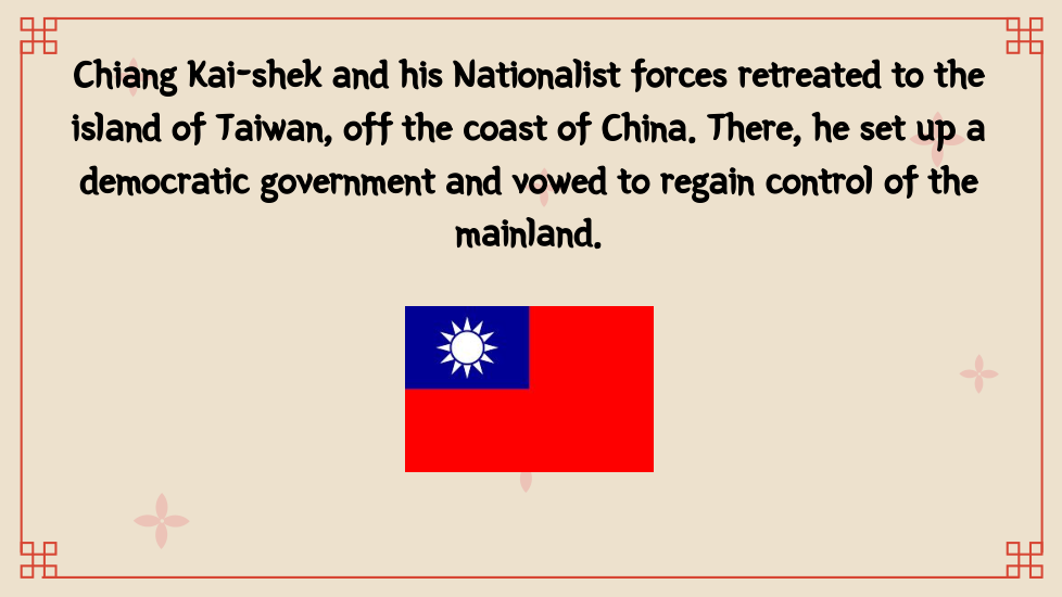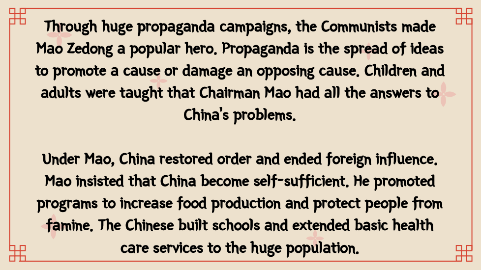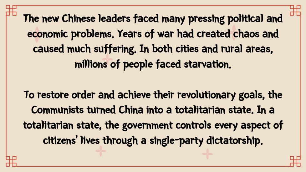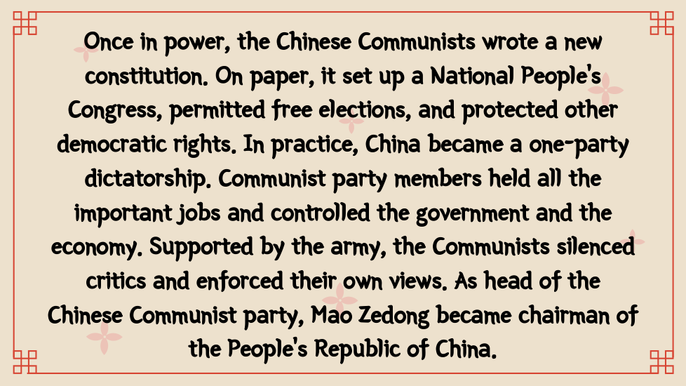Once in power, the Chinese Communists wrote a new constitution. On paper, it set up a National People’s Congress, permitted free elections, and protected other democratic rights. In practice, China became a one-party dictatorship. Communist party members held all the important jobs and controlled the government and the economy. Supported by the army, the Communists silenced critics and enforced their own views. As head of the Chinese Communist party, Mao Zedong became chairman of the People’s Republic of China.