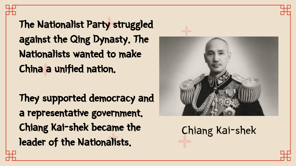 The Nationalist Party struggled against the Qing Dynasty. The Nationalists wanted to make China a unified nation. They supported ______________ and a representative government. ____________________ became the leader of the Nationalists.