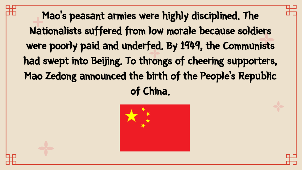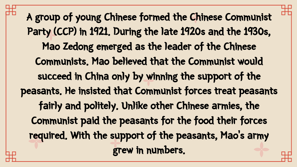 A group of young Chinese formed the Chinese Communist Party (CCP) in 1921. During the late 1920s and the 1930s, Mao Zedong emerged as the leader of the Chinese Communists. Mao believed that the Communist would succeed in China only by winning the support of the peasants. He insisted that Communist forces treat peasants fairly and politely. Unlike other Chinese armies, the Communist paid the peasants for the food their forces required. With the support of the peasants, Mao’s army grew in numbers.