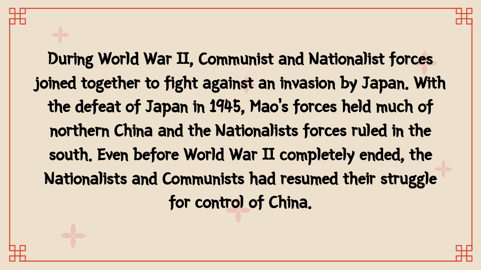 During World War II, Communist and Nationalist forces continued fighting each other while also fighting against an invasion by Japan.