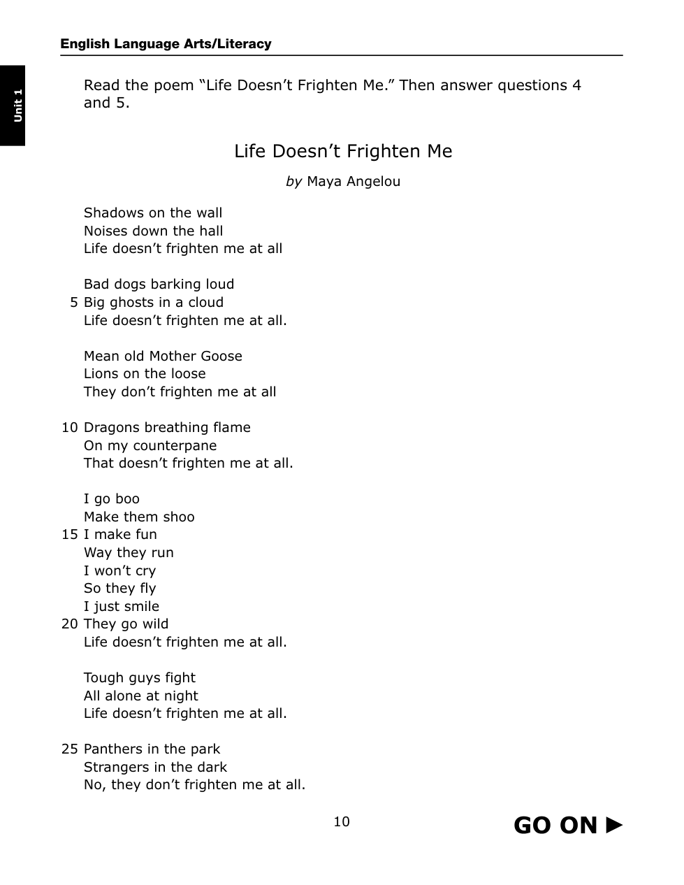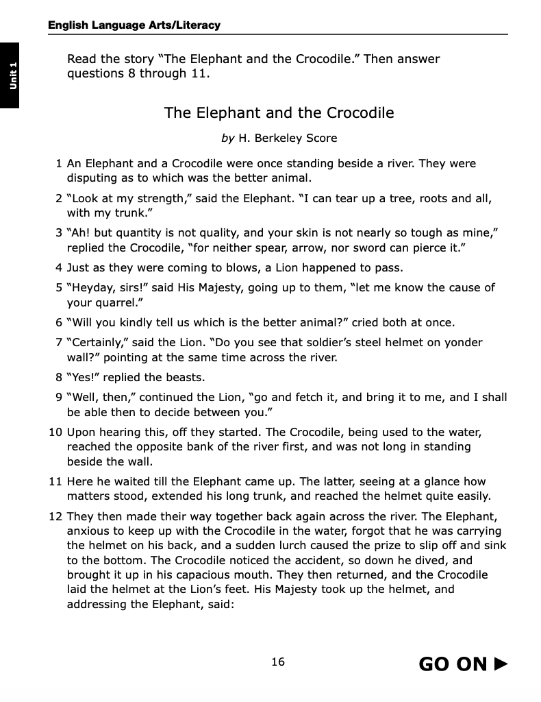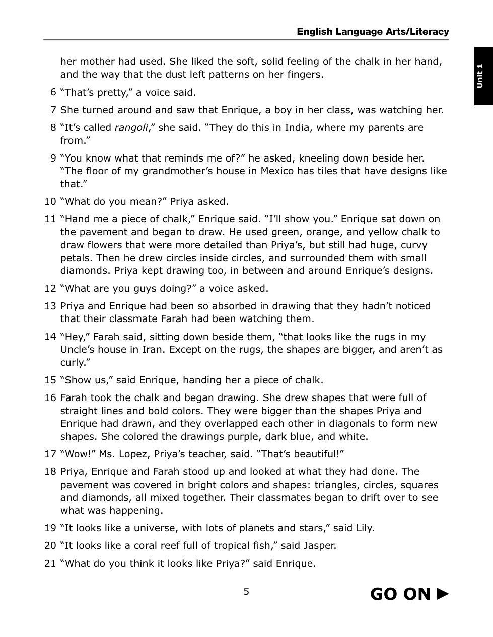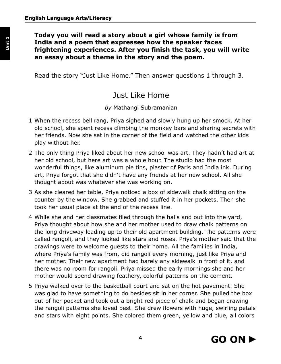 Today, you will take Unit 1 of the Grade 4 English Language Arts/Literacy Practice Test.
