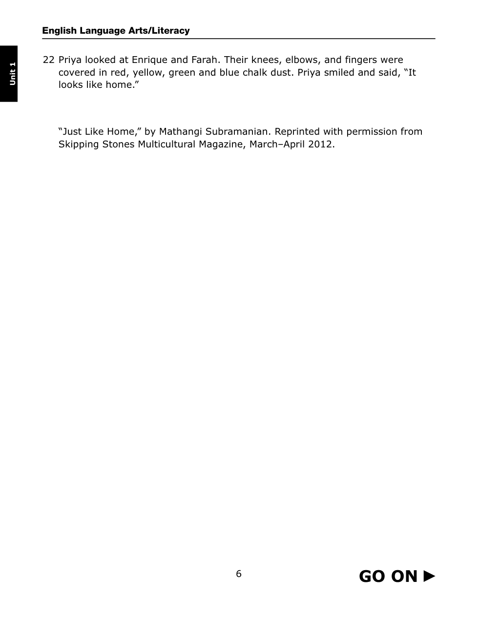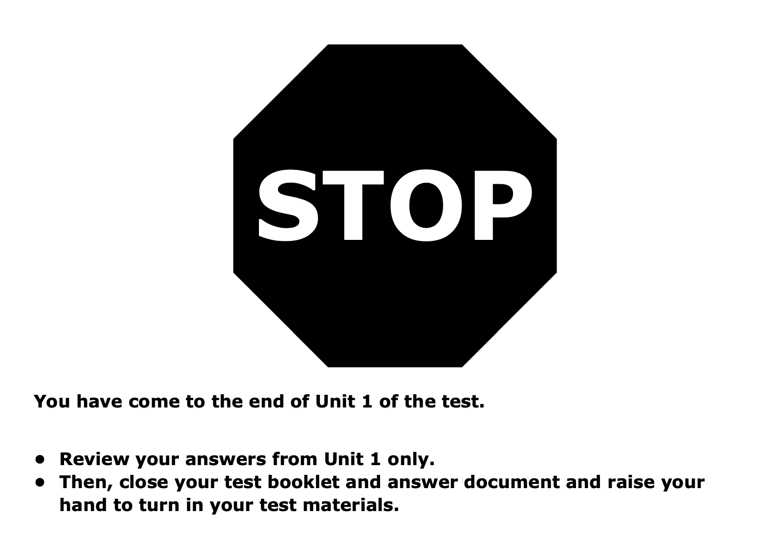 If you do not know the answer to a question, you may go on to the next question. If you finish early, you may review your answers and any questions you did not answer in this unit ONLY. Do not go past the stop sign.