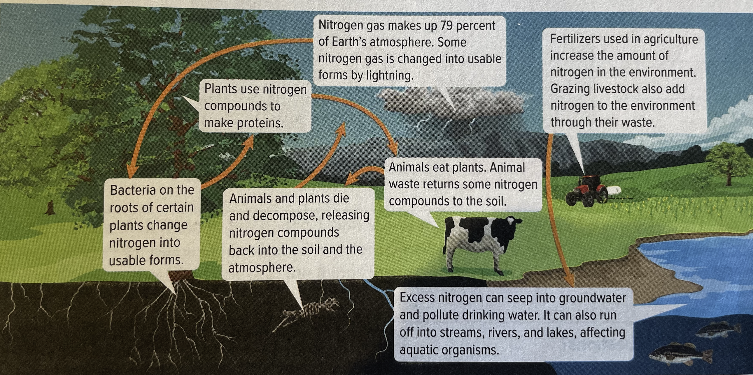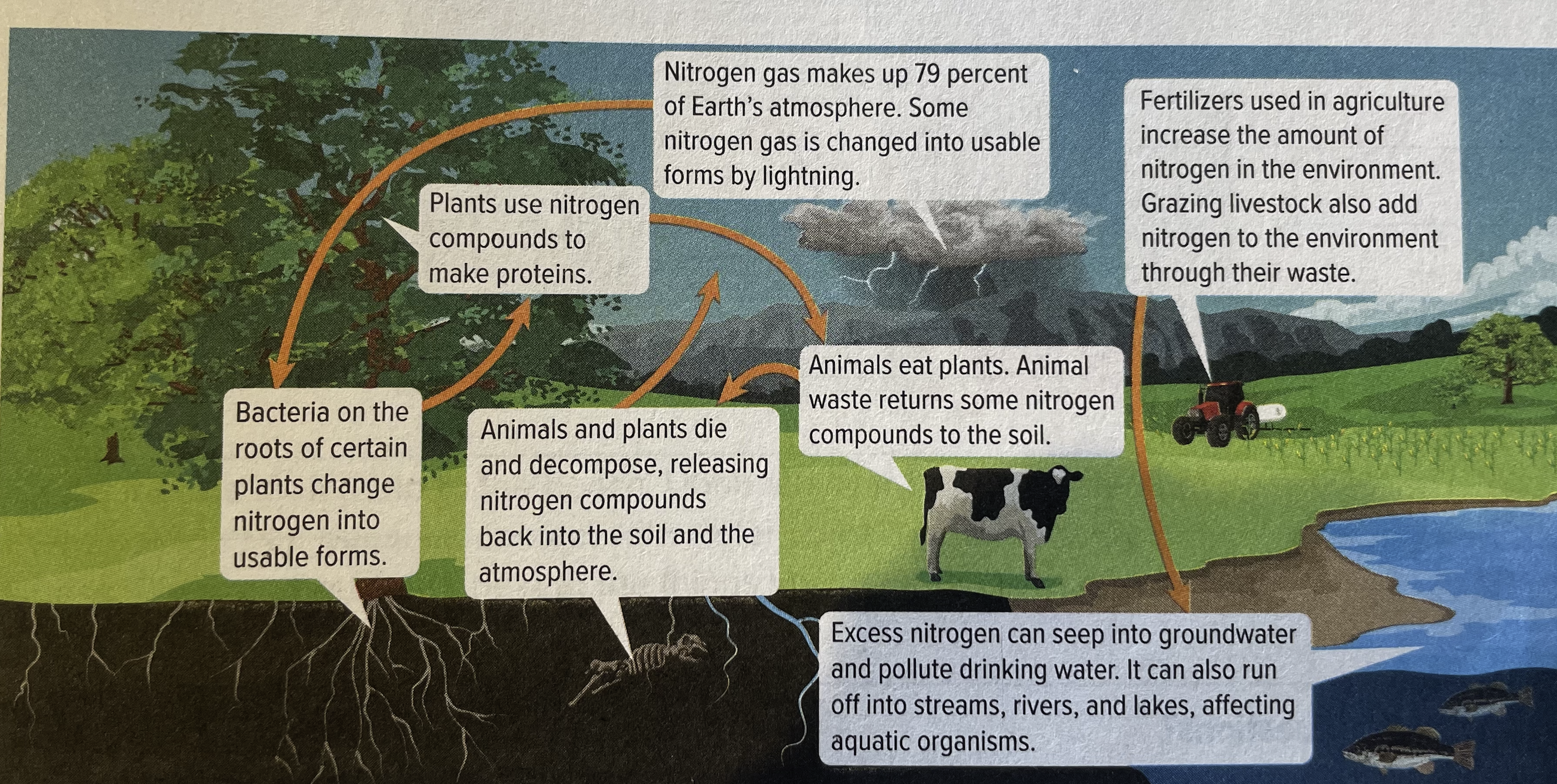 Nitrogen is an element that cycles naturally through ecosystems. Living things use nitrogen to make proteins. When these living things die and decompose or produce waste, they release nitrogen into the soil or the atmosphere. Scientists estimate that human activities have doubled the amount of nitrogen cycling through ecosystems.