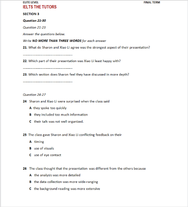 - Kỹ năng nghe (IELTS Listening): 30 phút