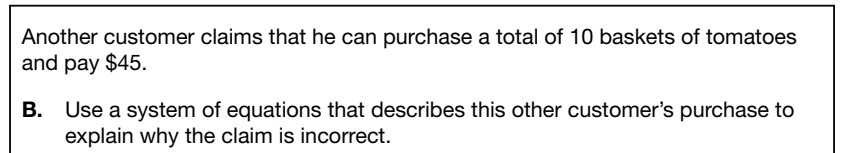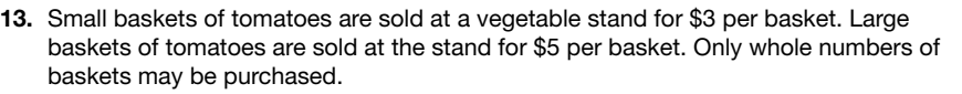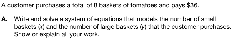 NOTE: YOU EARN A SCORE FROM 1-4. YOU DO NOT GET A 4 JUST FOR THE CORRECT ANSWER. YOU MUST SHOW AND EXPLAIN ALL YOUR STEPS. BE SURE LABEL EVERYTHING (such as x and y or tomatoes and baskets or small and large or $ and $ per basket, etc).