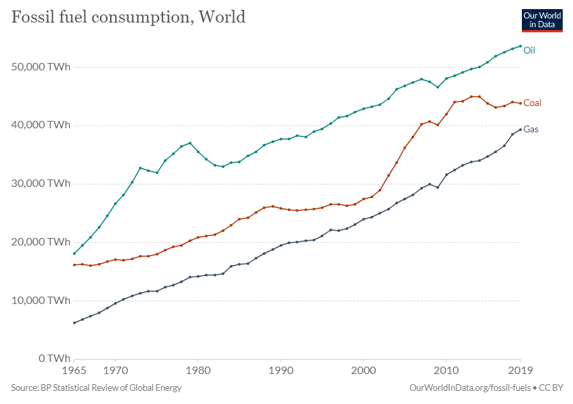 Look at the graph. What happened to the amount of fossil fuels that people used between 1965 and 2019?