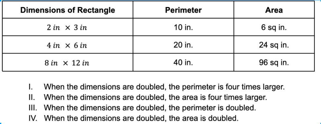The table below shows the perimeter and area of different rectangles. Which statement(s) are true?