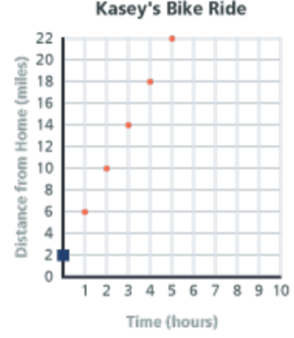 The graph shows Kasey’s distance from home over time as she rides her bike. Describe the meaning of the point represented by the square on the graph. If you can, write an equation to describe this relationship.