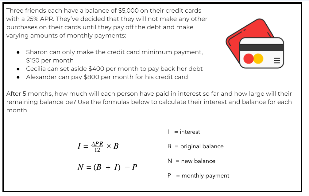 Paying the minimum on a credit card can feel a bit like running on a treadmill - you will keep chasing that balance but won’t get very far! In this activity, you will learn how compound interest works by comparing monthly interest and credit card balances to see just how costly making only the minimum payments can be.