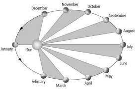 The drawing below shows Earth's orbit. In this case, the twelve positions are each exactly 30 days apart. Comparing the arc of September to October the arc from December to January the