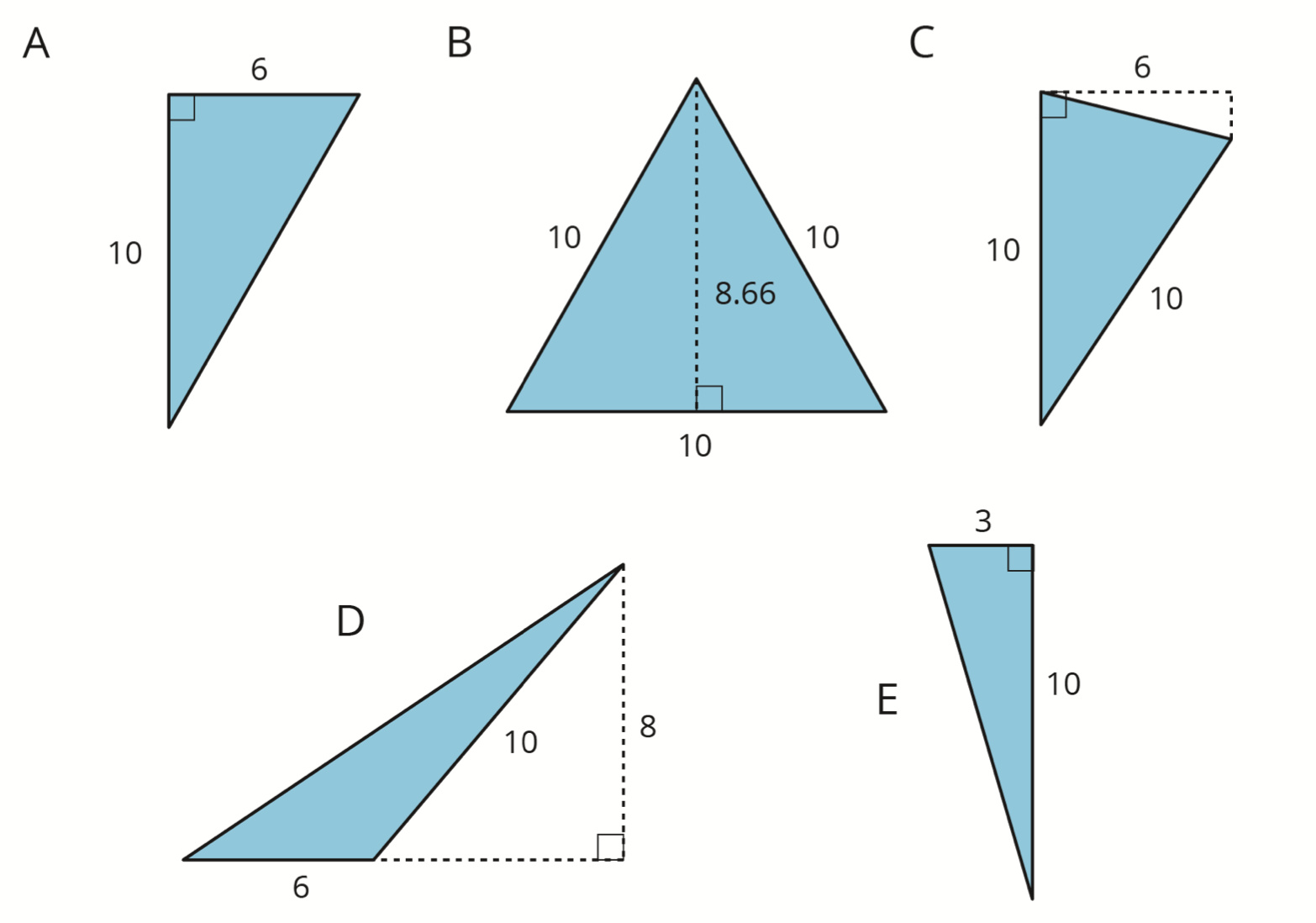 Select all the triangles that have an area of 30 square units.