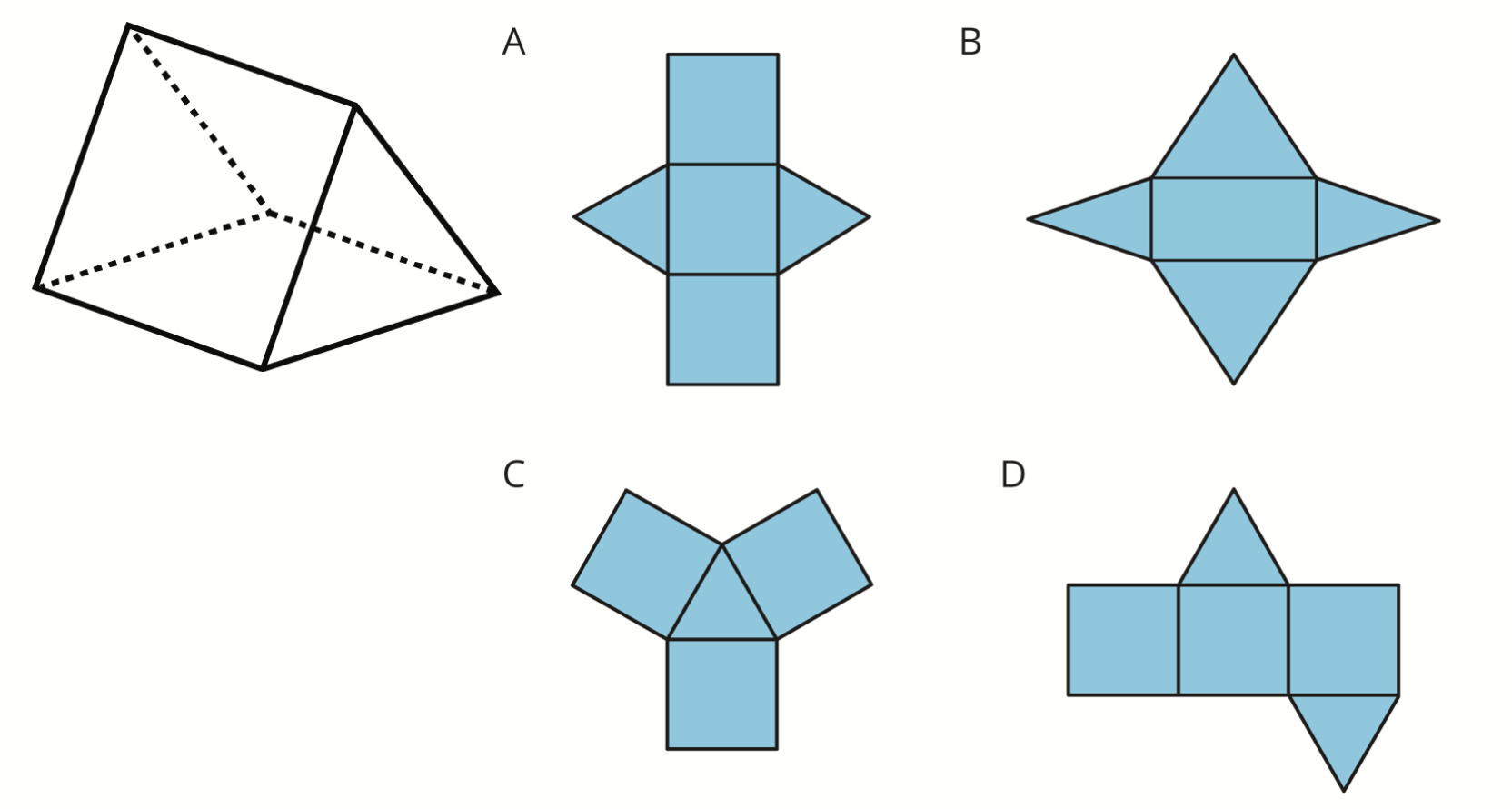 Select all of the nets that can be folded and assembled into a triangular prism like this one.