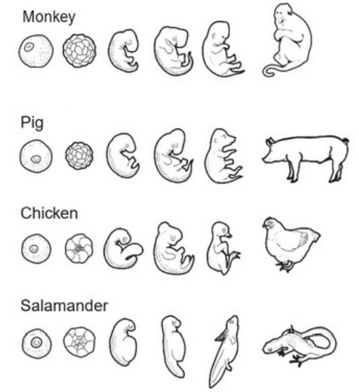 The embryos of all animals with backbones share an identical pattern of development into adult form. This is what they said.