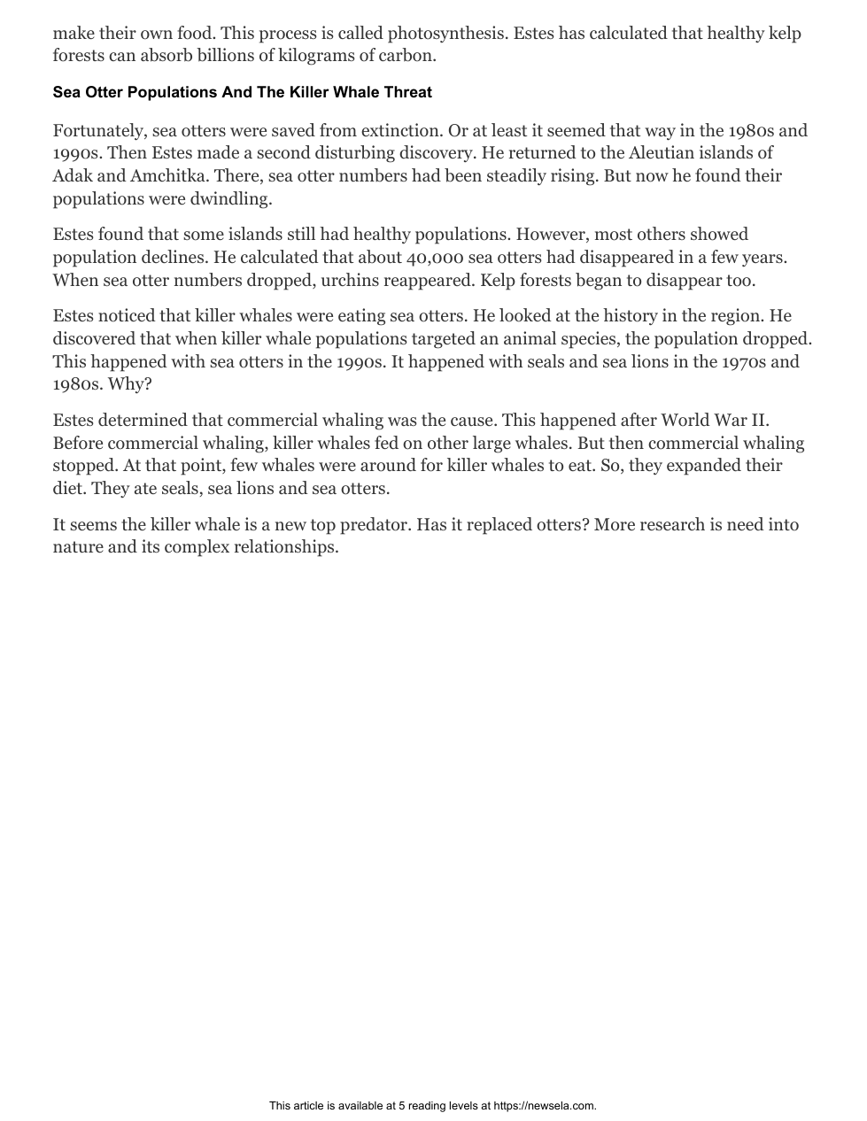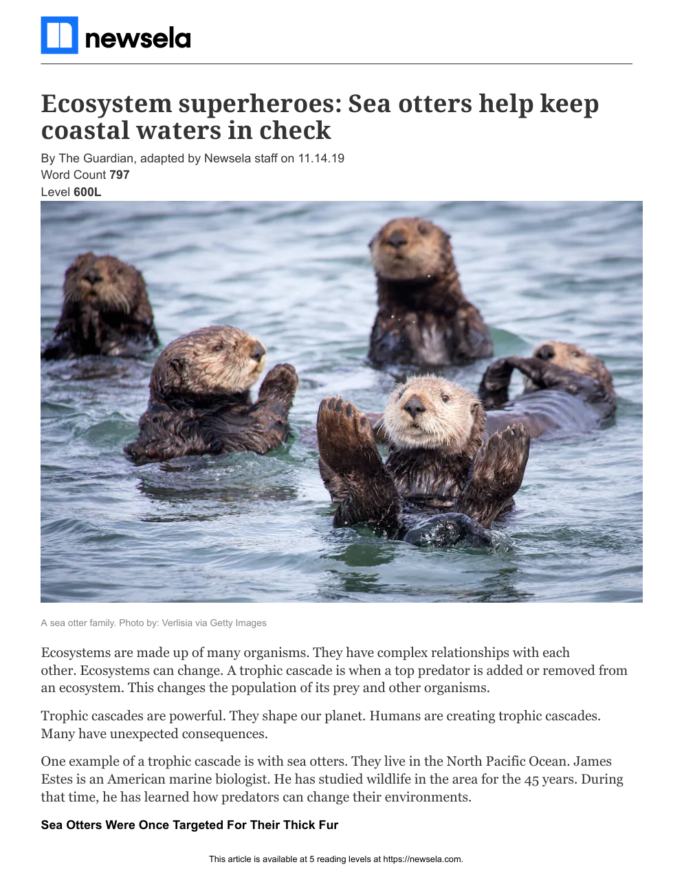 "Sea otters are a keystone species. Ecosystems depend on keystone species. Sea otters keep the kelp forests healthy. This helps local species too. They include fish, mussels and microorganisms."
