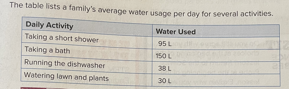 The family wishes to reduce their weekly water usage as much as possible. Here are their proposals for how to do this. Which will save the most water__________