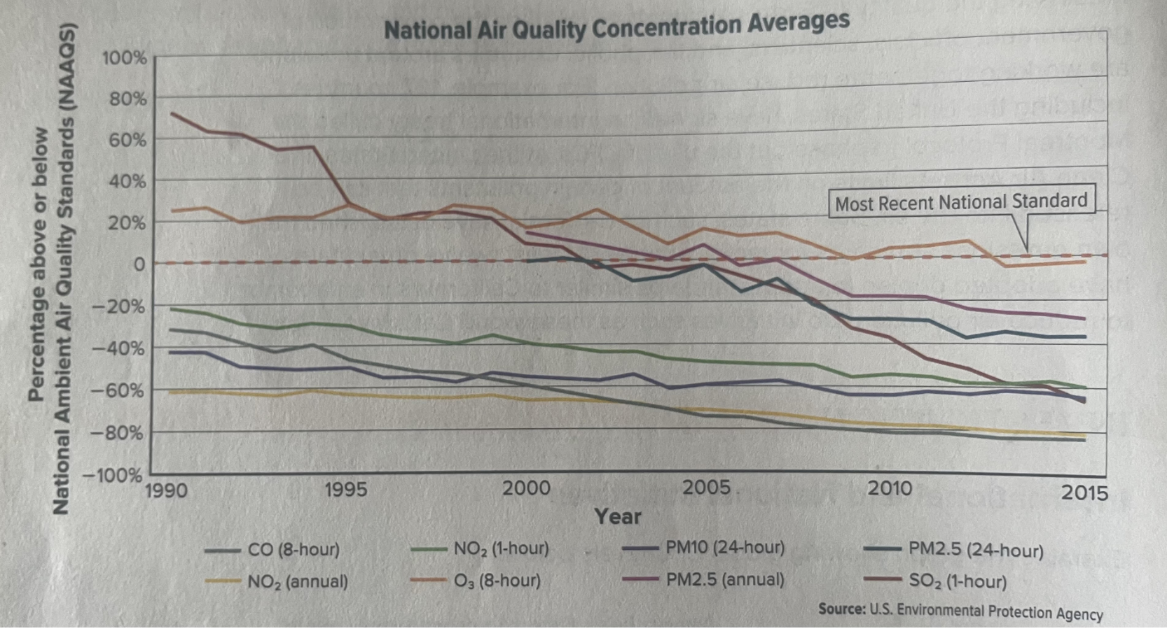 Now take a look at the graph showing the atmospheric levels of several types of air pollutants in the United States.