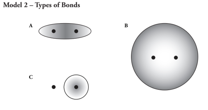 The figures in Model 2 depict the valence electron distribution around bonded atoms. The black dots represent the nuclei of the two atoms that are bonded. The circles and ellipses represent the area where the bonded valence electrons could be. Darker shading indicates a higher probability of finding the electrons in that space.