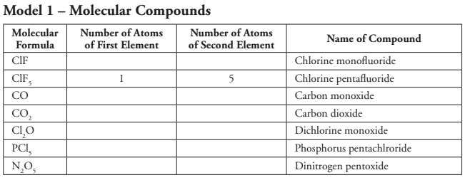 Look at the molecular formulas given in Model 1 for various molecular compounds. How many different elements are present in each compound shown?