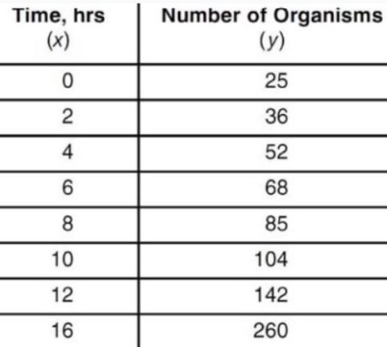 A population of single-celled organisms were grown in a petri-dish over a period of 16 hours. The number of organisms at a given time is recorded in the table.