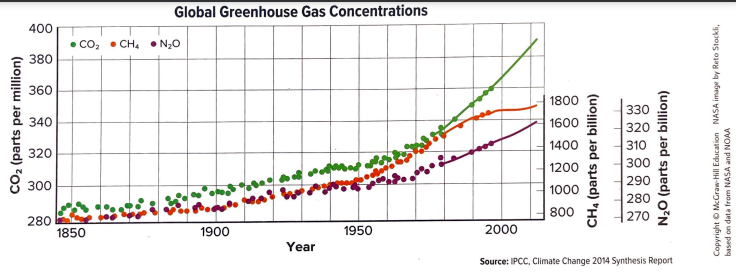 What has happened to the levels of CO2, CH4, and N2O in the atmosphere over the last century?