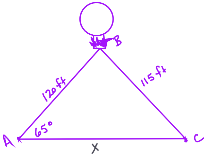 A hot air balloon is held at a constant altitude by 2 ropes that are anchored to the ground. One rope is 120 feet long and makes an angle of 65 degrees with the ground. The other rope is 115 feet long. What is the distance between the points on the ground where the 2 ropes are anchored? Include your answers for both distances if 2 answers are possible.
