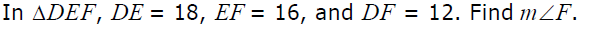 Draw a picture and label it with the information...rename the angles A, B and C (like we did in class). Then, use the law of cosines to find the measure of Angle F.