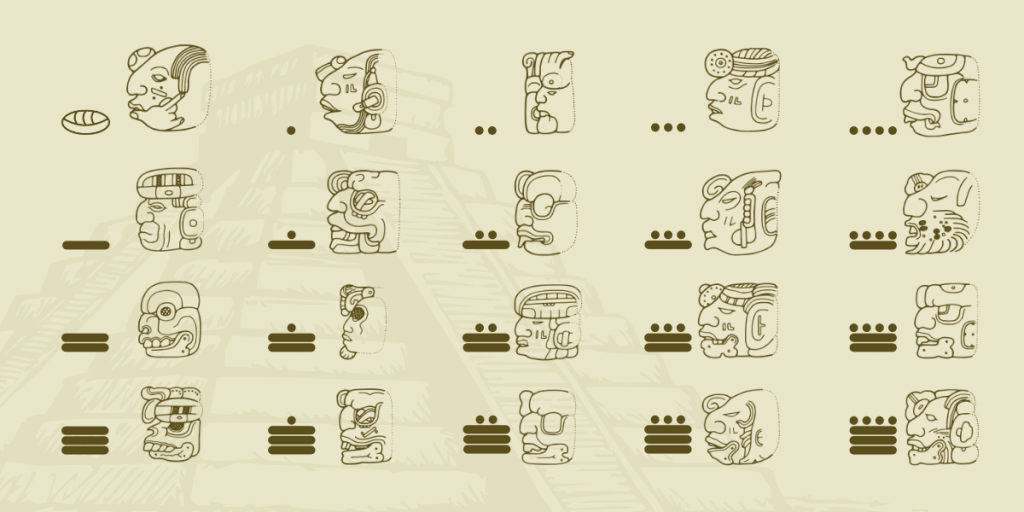 The Mayans created their own Math on their own separate from the rest of the world. The image to the left shows the two number systems of the Maya, Mayan Numerals and Ritual Numerals. One for trading goods and one for their calendars, which used the faces for gods as stand-ins for numbers. The Mayans were in fact the first people to invent the concept of the number zero (0)!
