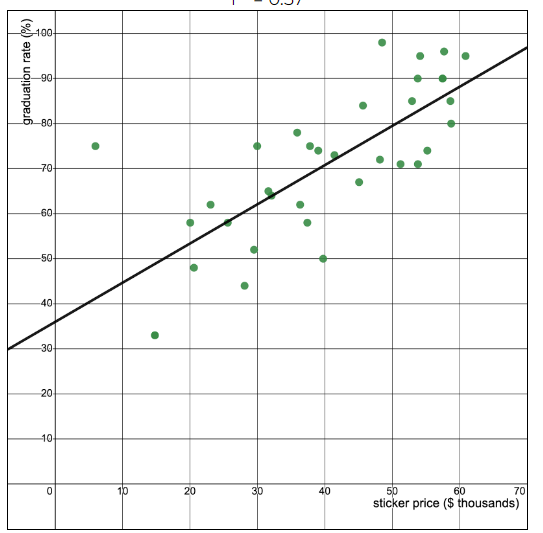 Ethan is researching the relationship between a college’s sticker price of a college and graduation rate. He finds data for 35 4-year colleges and uses “sticker price” to represent the published annual tuition and fees for an out-of-state student.[1]