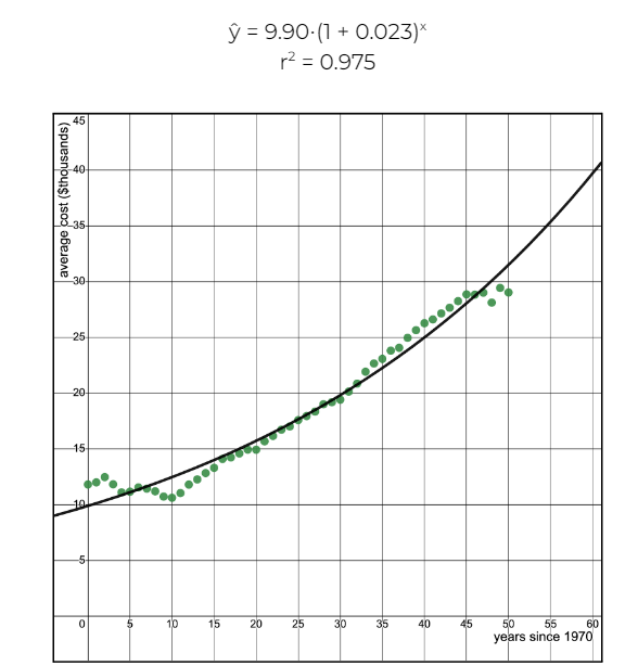 Kiana is researching how the costs of college have changed over time. She finds data on the average annual cost of attending a 4-year college since 1970, adjusted for inflation. It includes the cost of tuition, required fees, housing, and food.