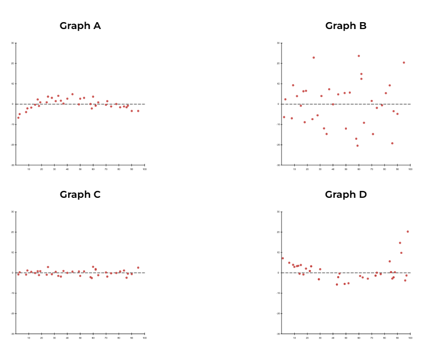 We can learn a lot more about our model from residuals. A residual plot is a graph that shows just the residuals from a regression model. Analyzing it can help you notice patterns and determine whether you’ve chosen the best type of function to fit the data. Watch the video and answer the questions.