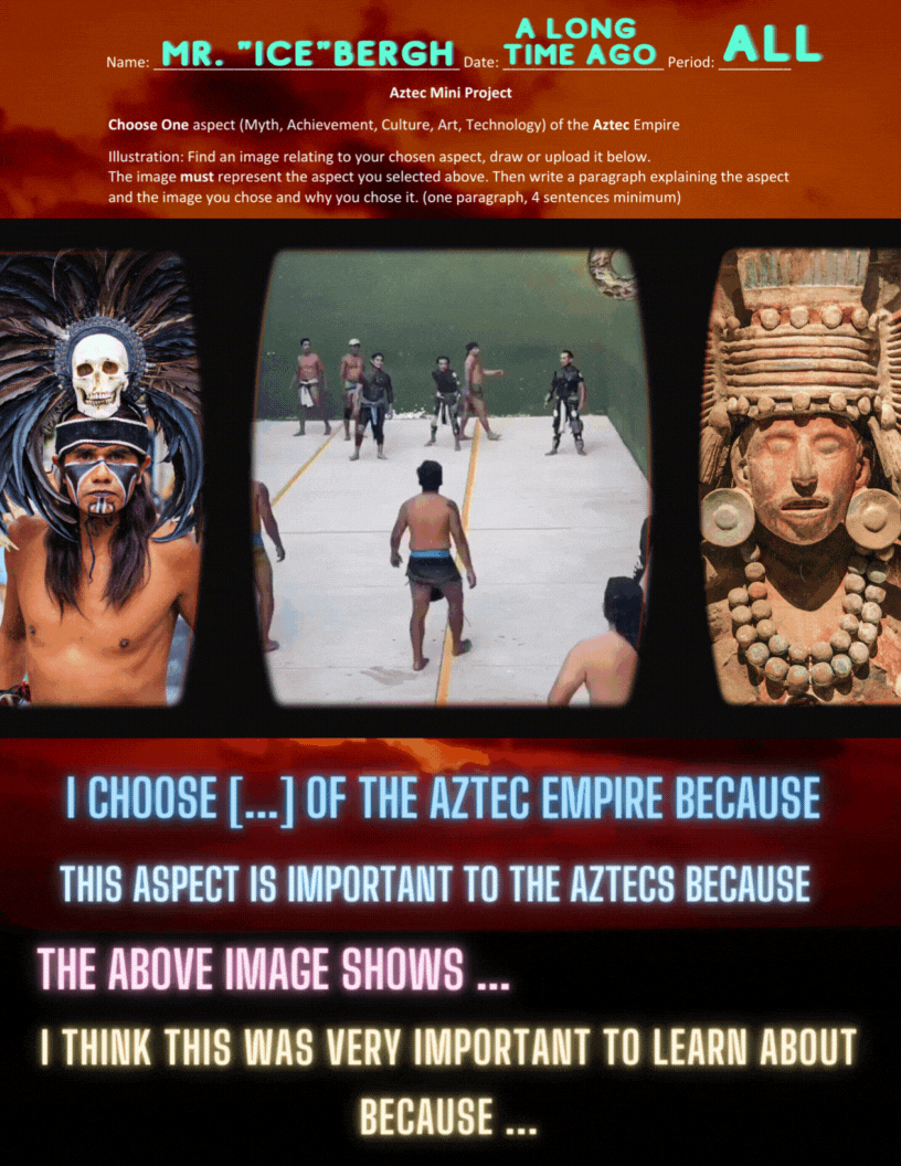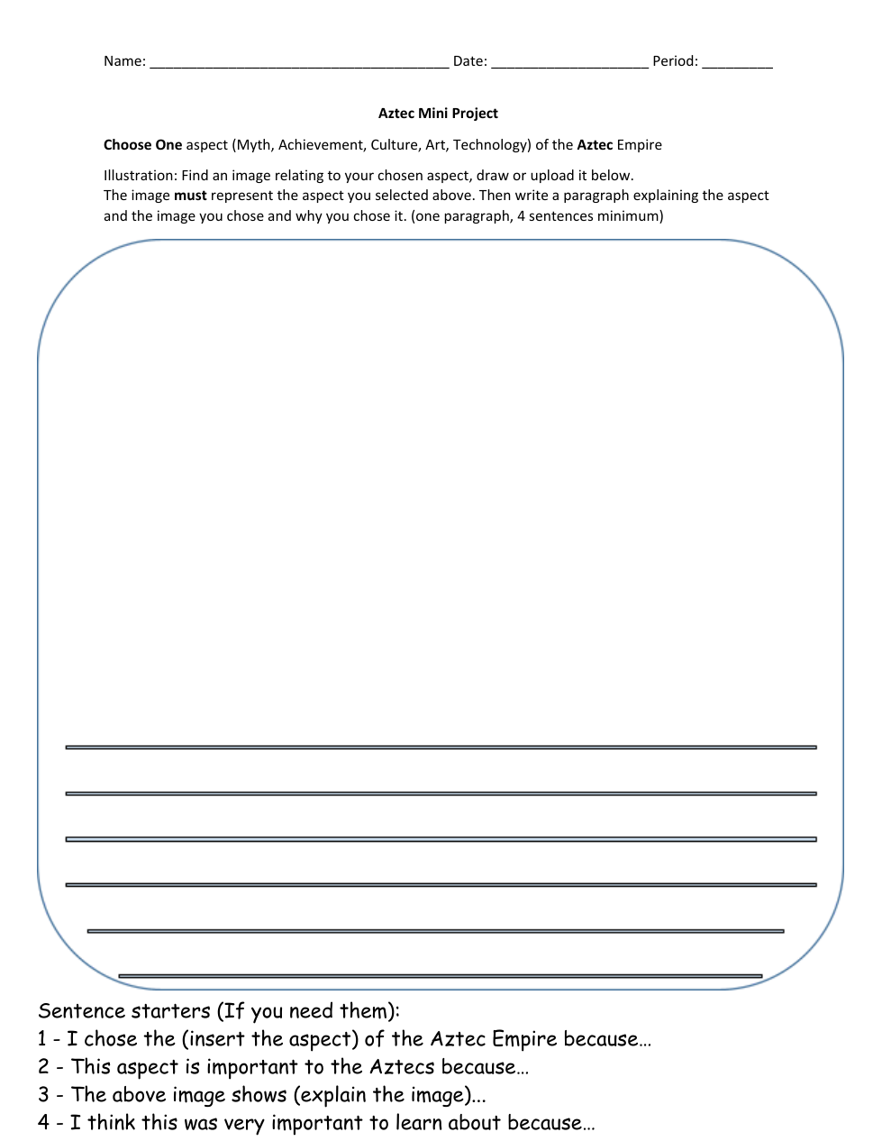 Step 4. Identify an aspect of the Aztec Empire you think is important, draw or find pictures of that aspect, and finally write four sentences about it. See example below for inspiration.