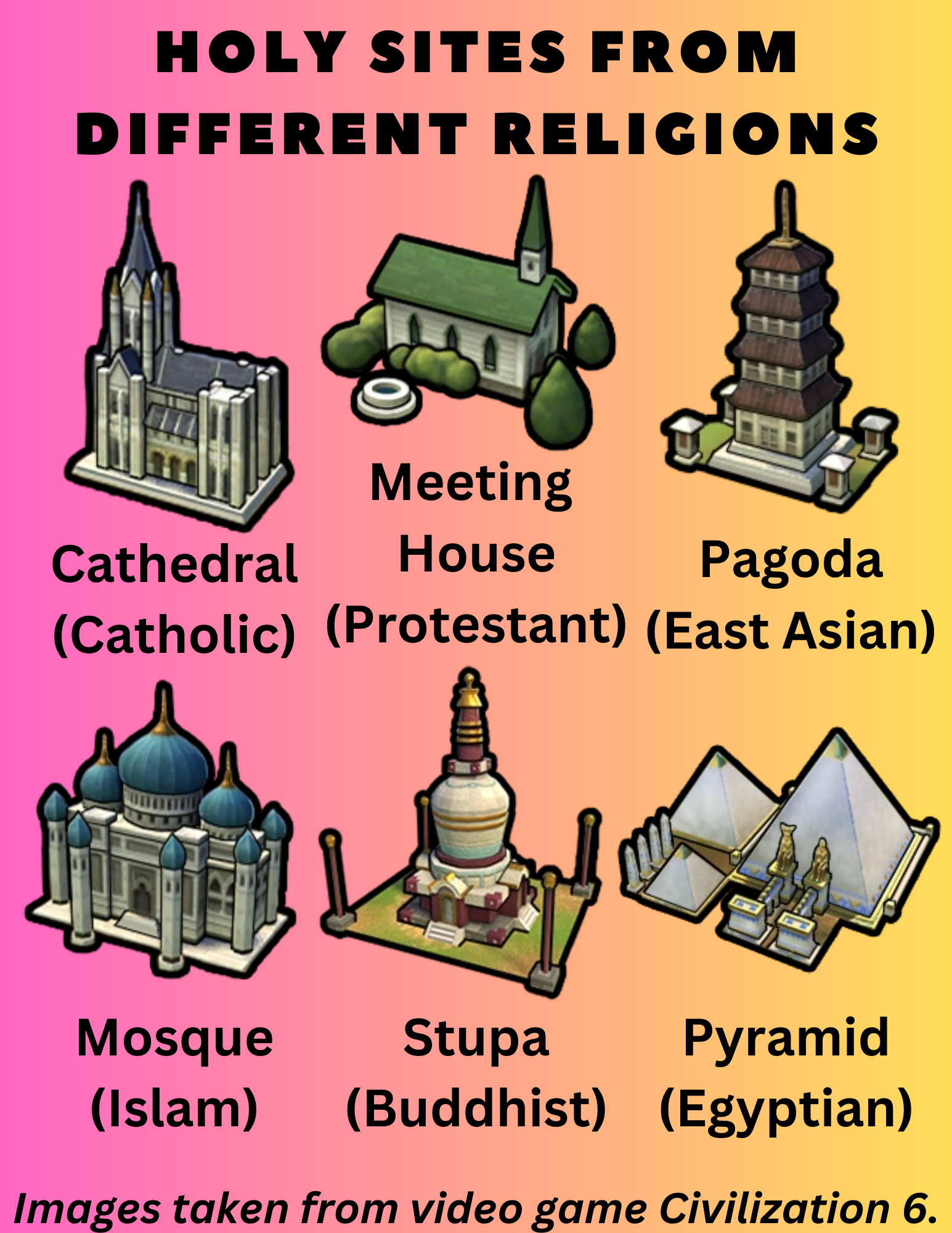 The Sumerians builtzigguratsto honor their gods. The Egyptians built pyramids. The picture to the left shows different temples or holy sites used by different religions across the world and time. There are SO many more types of holy sites then just these. We're going to create our own miniature holy site!