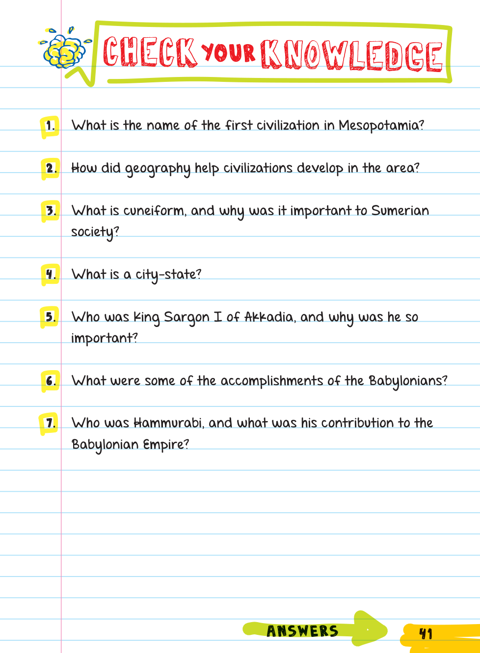 On a sheet of lined paper, title it CHECK YOUR KNOWLEDGE. This is our study guide. Use your knowledge, the Formative, your notes, and any projects to answer the questions. Write your answers on the sheet of lined paper.